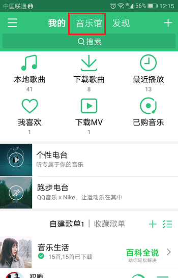 第一步在我们的手机里面打开音乐应用,进去我的界面之后,点击音乐馆,如下图所示: