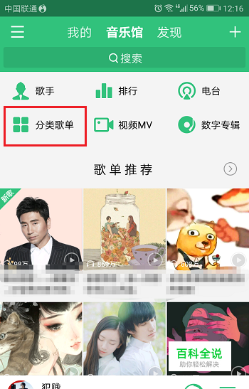 第二步点击音乐馆之后,选择下方的分类歌单,如下图所示: