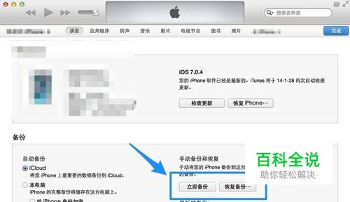 可以用 iTunes 在电脑上为 iPad 备份资料,比如相片,应用软件,通讯录,信息等。在 iPhone 的摘要界面,可以备份也可以恢复,如图所示
