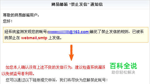入口二:在收到的网易邮箱“禁止发信”通知信读信页面。