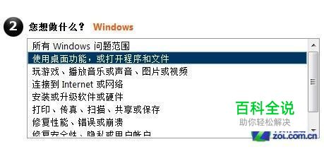 比如你的Win7桌面图标出了问题,那就可以在自助修复向导中先点击“Windows”,再从下面的列表中选择“使用桌面功能,或打开程序和文件”。