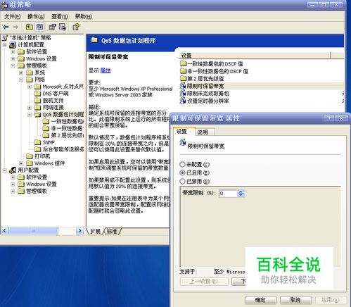 第二步 展开“计算机配置——管理模板——网络——QoS数据包计划程序”,双击右面设置栏中的“限制可保留带宽”,在打开的属性对话框中的“设置”选项卡中将“限制可保留带宽”设置为“已启用”,然后在下面展开的“带宽限制(%)”栏将带宽值“20”设置为“0”即可。