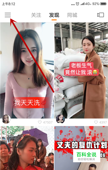 在快手里面点击左上角的【三】,如图所示。
