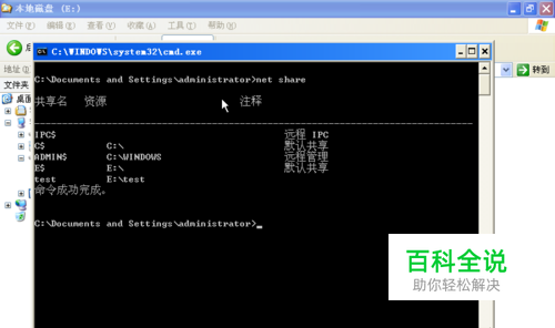 net share查看在windows上共享,例如小编这里使用test这个目录。