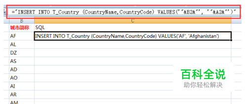 直接在第一条后面加公式 ="INSERT INTO T_Country (CountryName,CountryCode) VALUES('"&A2&"', '"&B2&"')"