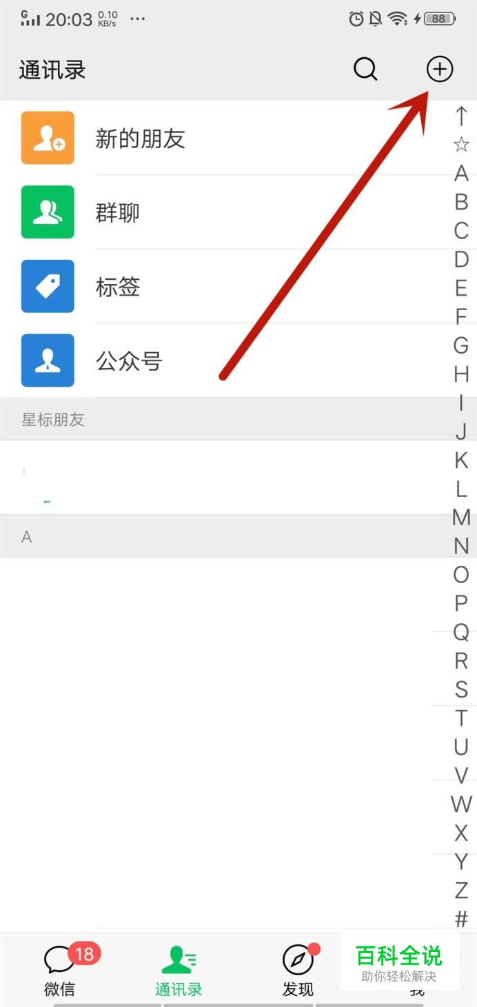 首先需要在微信的通讯录页面,点击右上角的“+”按钮,如图所示。