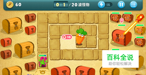 游戏开始后首先暂停,在怪物出口放一个毒针,升级到中级。一个毒针完全可以抵抗前几关小怪物。 接着在右上方空位上放一个火瓶,火瓶一定要攻击最大的箱子,因为攻击这个箱子的同时,四周的小箱子也会被打掉。