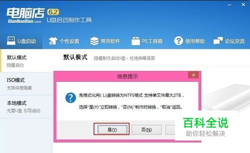 选择NTFS格式后会有如下的提示,按照下图选择确定即可