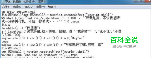 今天给大家带来一个整人的VBS脚本,对方不说“我是猪”就定时关机的恶搞脚本,如果把他发给你的好友 他不懂的话如果不输“我是猪“” 电脑就会在你设定的时间内关机。我在以下代码内设置的是3分钟。