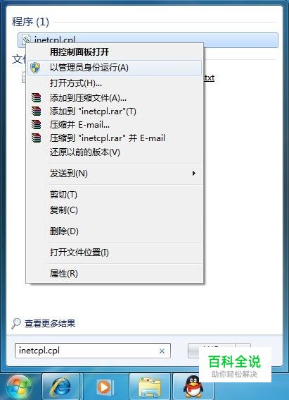 在开始搜索框中键入“inetcpl.cpl”命令,右键单击inetcpl.cpl“以管理员身份运行”,若弹出用户账户控制窗口,请允许以继续