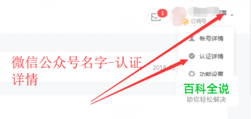 进入自己的微信公众号平台,在右上角,点击公众号名字,下拉菜单栏选中“认证详情。”