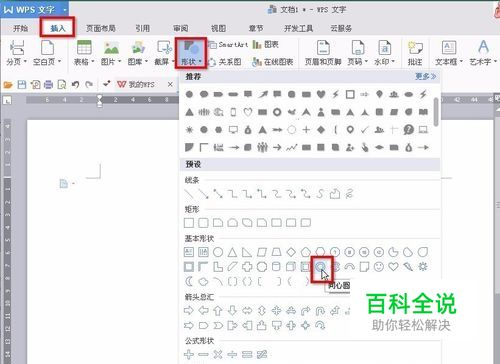 打开或者新建word文档后,点击“插入”--“形状”--“同心圆”(可以插入任意自己喜欢的形状。