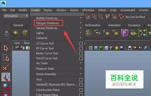 打开Maya之后我们在菜单里找到create选项,点击该选项在其下拉菜单里找到polygon primitives选项,如图所示: