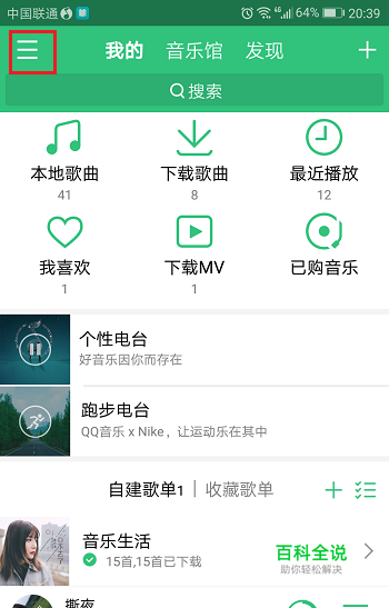 第一步在我们的手机里面打开音乐应用,进去我的界面之后,点击左上方的列表图标,如下图所示: