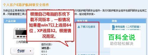 点击 【网银E路护航安全组件】,选择 【下载32位版本】或【下载64位版本】进行下载。