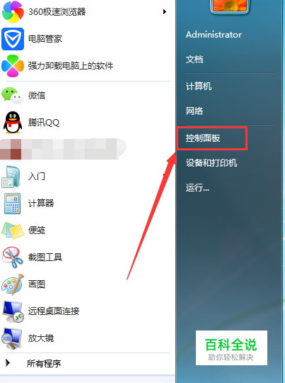 第一步,首先我们打开控制面板,控制面板可以在电脑的“开始”处找到,如下图所示;
