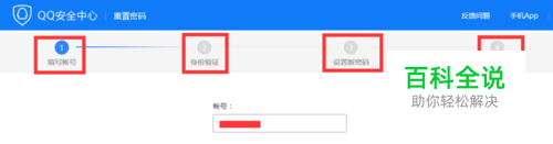 点击“找回密码”,出现如图的页面,我们可以看到页面中上部有“填写账号”—“身份验证”—“设置新密码”—“完成”公四部分组成