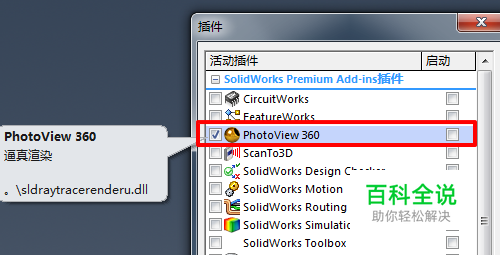 首先确认一下PhotoView360插件是否正确安装,打开solidworks,点“工具”——“插件”,弹出的插件列表里应该有PhotoView360,前面的勾打上,确定,插件就载入了。