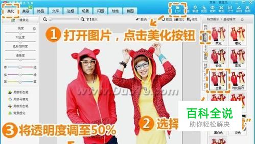 在“美图秀秀”中打开待处理的照片,进入“美化”菜单下,选择“基础-去雾”,并将透明度调至50%,提亮照片色彩度。