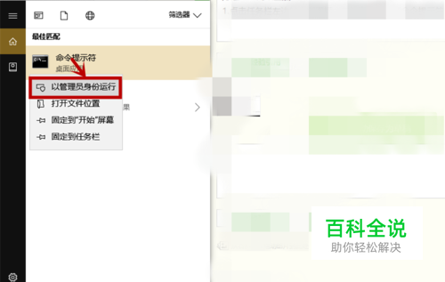 2.右击搜索到的【命令提示符】,在弹出菜单选择【以管理员身份运行】选项