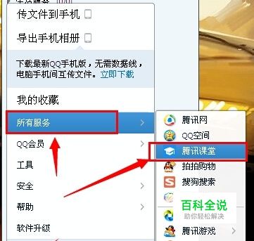我们习惯了用QQ,所以这里也是直接讲解使用QQ登录。 打开QQ主面板,选择主菜单,在所有服务里,可以看到有个“腾讯课堂”: