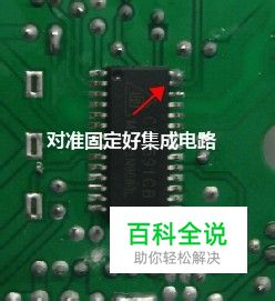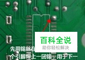 先用锡丝在PCB板上集成电路位置某角的两个引脚焊盘焊上一团锡