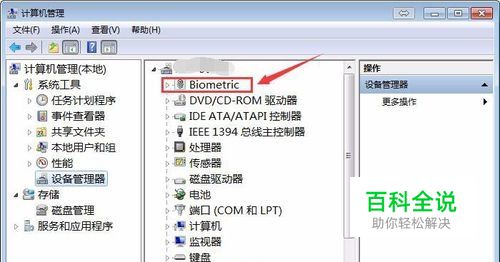 安装好驱动后,在计算机管理窗口的中间窗就有指纹传感器设备。