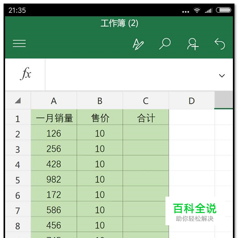 手机上打开工作薄,打开要操作的工作表。工作表中如下图所示的数据,在“合计"这一列中算出相应的销售额。