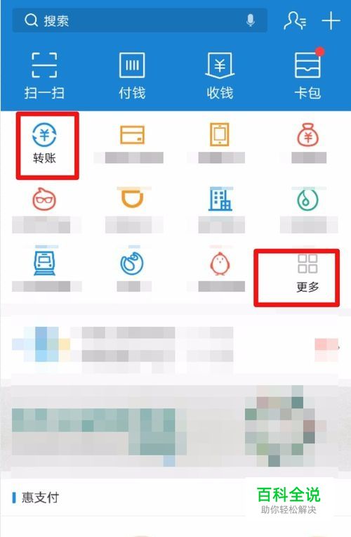 然后呢,我们需要进入到应用的首页,找到【转账】这个功能(若是首页没有看到这个功能我们可以点击页面右侧的“更多”按钮)。如图所示