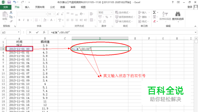 如果只是少量的数据我们可以通过键盘,逐个的敲进去就可以了。但是如果是成千上万的数据就不好办了,需要我们对其进行批量的修改。其实也是很简单的,只要在在某一列总相应行的单元格中编辑以下公式即可。在单元格中输入=A3&":00:00"回车即可,如下图示