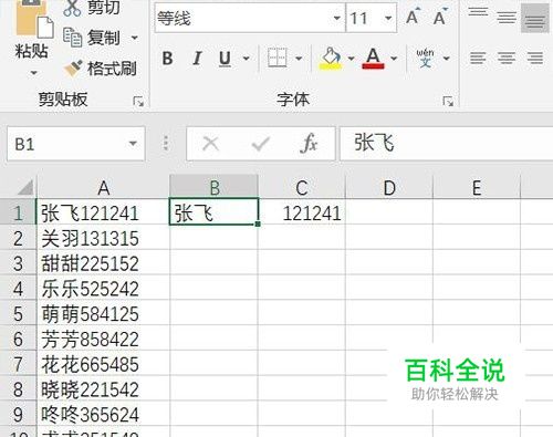 双击A列第一个表格,复制文字“张飞”并粘贴到B列的第一个单元格中;同理把A列第一个单元格里的数字复制粘贴到C列的第一个单元格中;