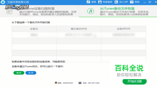 点击右上角“从iTunes备份文件恢复”,再点击下方备份文件,选中,点击“开始扫描”。