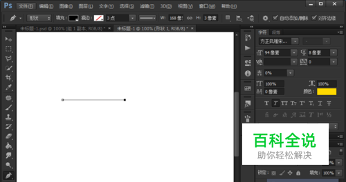 打开Photoshop CS6,选择【钢笔】工具,确定“工具模式”为【形状】,单击一个点后,再次单击,绘制直线。