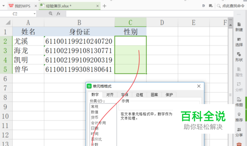 新建“性别”列。 新建一列命名为“性别”,用于存放持有人的性别,注意设置单元格格式为“常规”或“文本”。