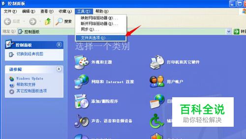 进入控制面板管理窗口,我们这里点击控制面板窗口上的“工具”选项,并从它选项下点选“文件夹选项”。