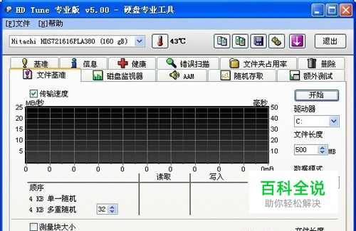 安装完成后,打开HD Tune 5.0后,我们先进行性能测试。先选择“基准”并勾选上读取,然后点击开始。