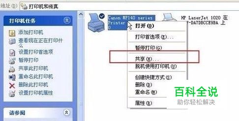 共享打印机实际操作。以佳能PIXMA MP145多功能一体机(隶属于Canon MP 140系列中的一款)为例说明,这是一款不具备网络功能的一体机,但是,通过连接一台电脑后,然后做相应的设置后能实现共享打印。 ① 在带有打印机的电脑上进行以下操作: 进入开始----直接找到打印机和传真,直接进入即可,如下图: 如果在开始菜单中没有找到“打印机和传真”入口,可以进入 开始--设置---控制面板 中找到。 ②进入到打印机与传真中心如下图所示: 之后在打印机上由键单击 -- 选择 共享 如上图.之后进入如下打印机共享操作界面。 如上图所示,点击“共享这台打印机”,并起一个共享名“lichaoMP140”,然后点击“确定”按键,之后将回到“打印机与传真中心”,如下图: 从上图中以看到打印机图标上多了一个手拖标,这时候说明打印机共享设置已经成功了。 到了这里基本上关于打印机共享使用已经设置到了一半,接下来要做的是如何在局域网内别的电脑能够找到打印机并使用。