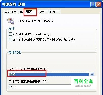 在打开的窗口中,切换至“高级”选项卡,然后从“在按下计算机电源时”下拉列表中选择“待机”。然后点击“确定”完成设置。