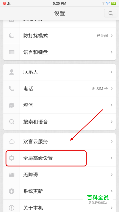 在设置中下滑页面找到下方的“全局高级设置”并进入。