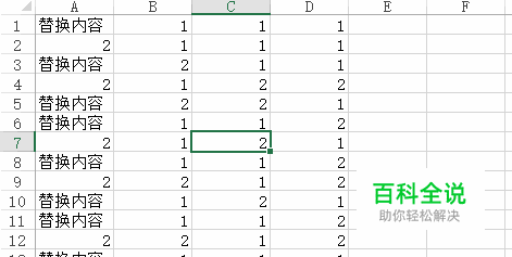 假设我们要完成如图所示的效果。把第一列的“1”都替换成“替换内容”。