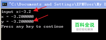 在VC 6.0下运行测试三组数据,第一组: x = -3.2 运行结果如下,可以看到当输入x = -3.2时,程序执行的是 y = x 操作。