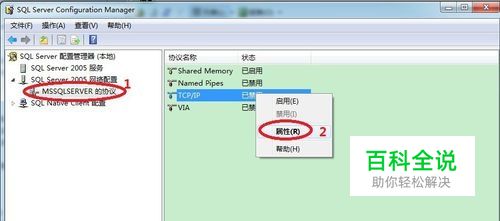 在SQL Server Configuration Manager里面,展开 SQL Server 2005网络配置,点击MSSQLSERVER的协议。右键选中TCP/IP--点击属性。