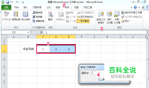 我们仍然选中所要 锁定的三个单元格点击 审阅选项卡中的 保护工作表接着 输入密码点击确定