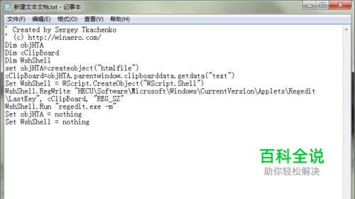 regnav.vbs文件制作方法:复制下面代码段,粘贴到txt文件里。 ' Created by Sergey Tkachenko ' (c) http://winaero.com/ Dim objHTA Dim cClipBoard Dim WshShell set objHTA=createobject("htmlfile") cClipBoard=objHTA.parentwindow.clipboarddata.getdata("text") Set WshShell = WScript.CreateObject("WScript.Shell") WshShell.RegWrite "HKCU\Software\Microsoft\Windows\CurrentVersion\Applets\Regedit\LastKey", cClipBoard, "REG_SZ" WshShell.Run "regedit.exe -m" Set objHTA = nothing Set WshShell = nothing