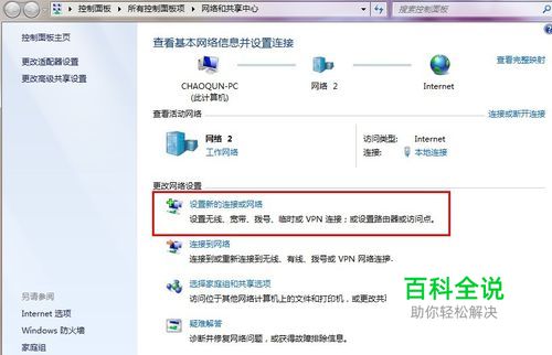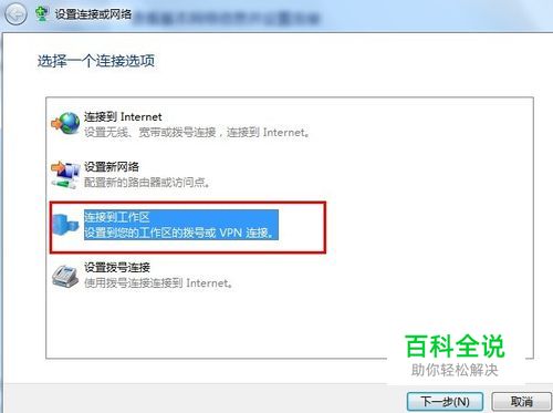 单击“设置新的连接或网络”出现 (图2) 选种“连接到工作区”点下一步。 (图3)