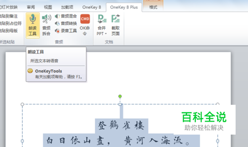 执行ctrl+a组合键全选文字内容,执行onekey 8 plus菜单,选择朗读工具选项。