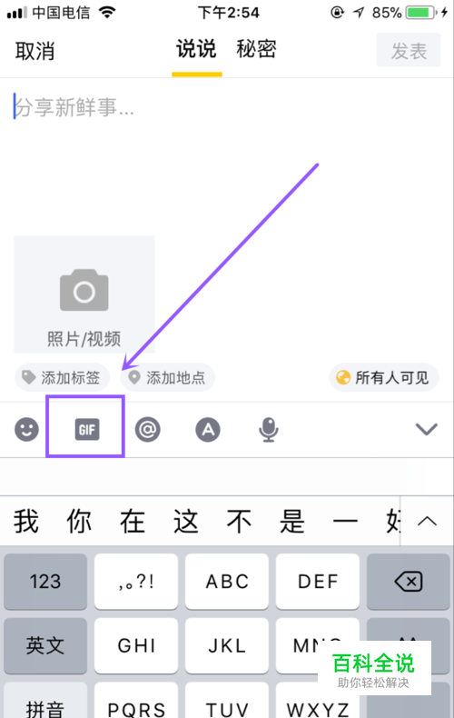 发表说说,如果是隐私动图,把查看权限调成“仅自己可见”,如果是搞笑的可以公开的,也可以直接“公开”发布到空间。