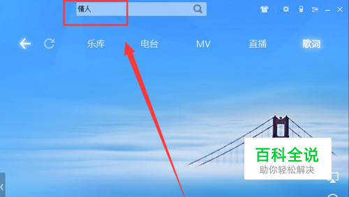 首先在电脑上打开酷狗音乐,然后在上方的搜索栏里输入想要唱的歌曲名,如下图所示。
