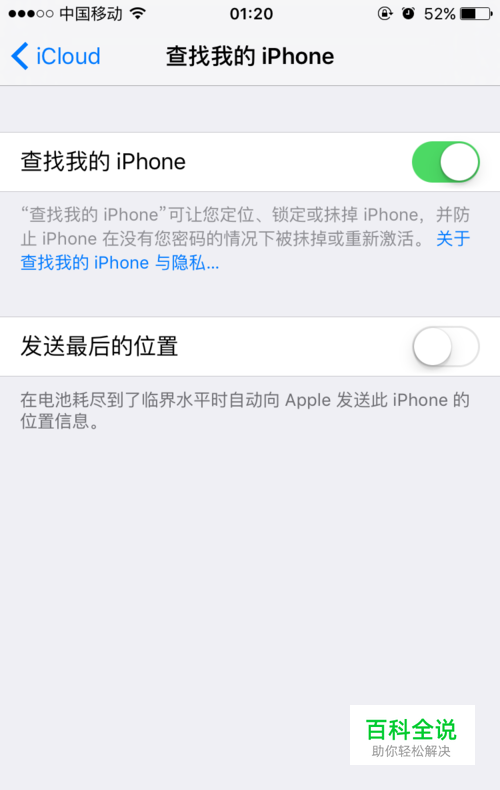 首先我们要确认我丢失的那只iphone手机上的查找我的iphone是开着的,就是这个。