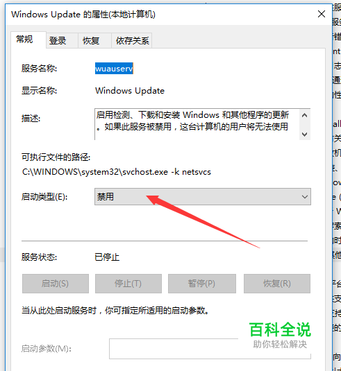 双击 windows update,在启动类型处 设置为 禁用